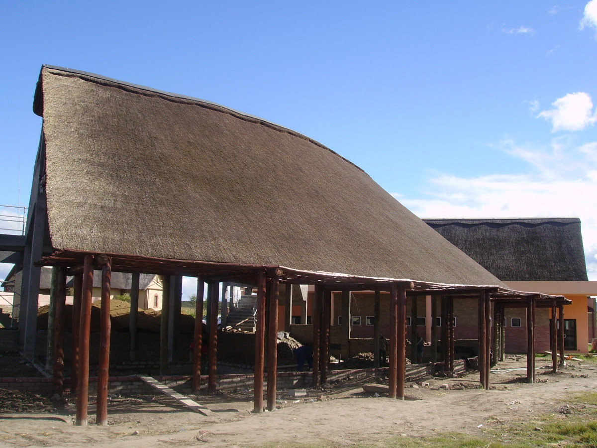 In 2012 Cintsa Thatching Cc. was commissioned to construct the highly engineered roof structure in poles, for the new thatched conference centre just outside of Mthatha in the Eastern Cape. We also thatched the “double” roof, and installed custom-made triangular windows into the thatch to allow more light to enter the building. You can see the thatched conference on your left hand-side as you drive past Mthatha Ultra City, towards Mthatha, on the N2.